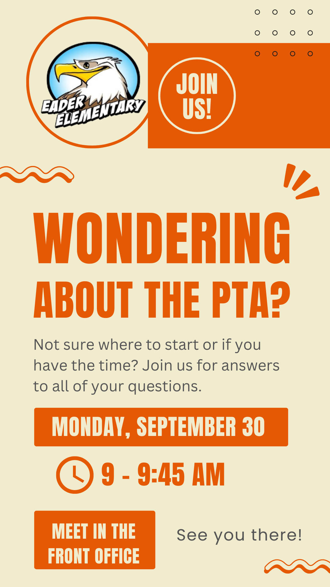 A meeting will be held on Monday, September 30th, at 9:00 am for any parents interested in learning more about the Eader PTA. We welcome all who would like to get involved and find out more about how the PTA supports our school community. See the flyer below for additional details.