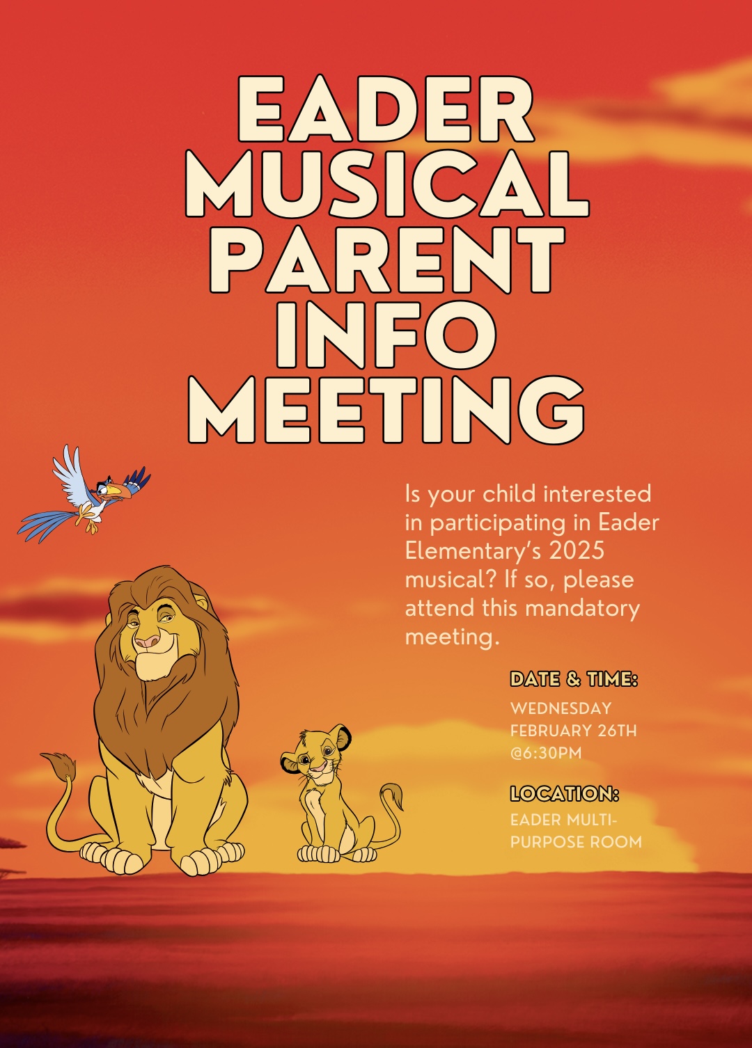Exciting news—Eader is gearing up for its school musical! If your child is interested in participating, please join us for the Eader Musical Parent Information Night on Wednesday, February 26 at 6:30 pm.