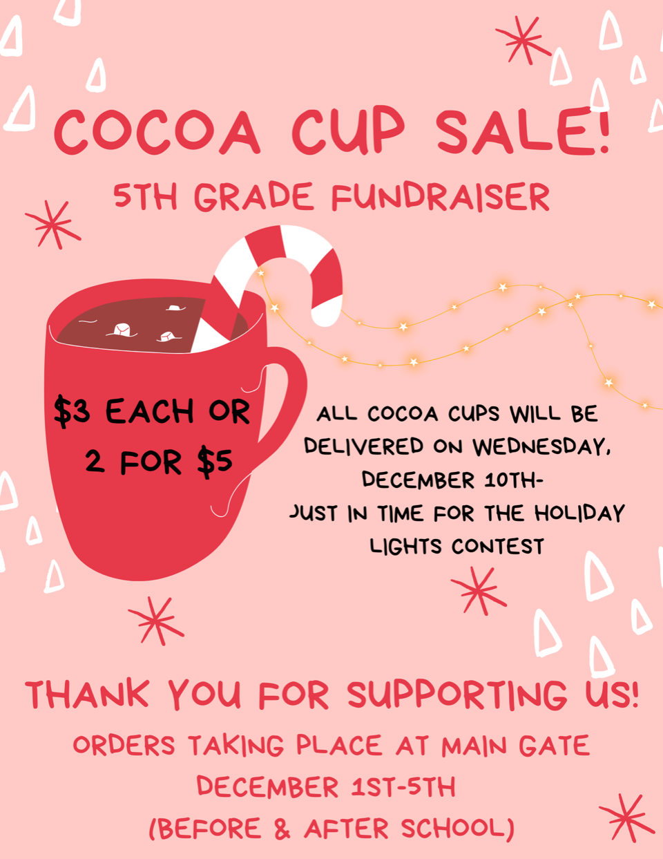 Our 5th grade holiday hot cocoa cup sale begins tomorrow!