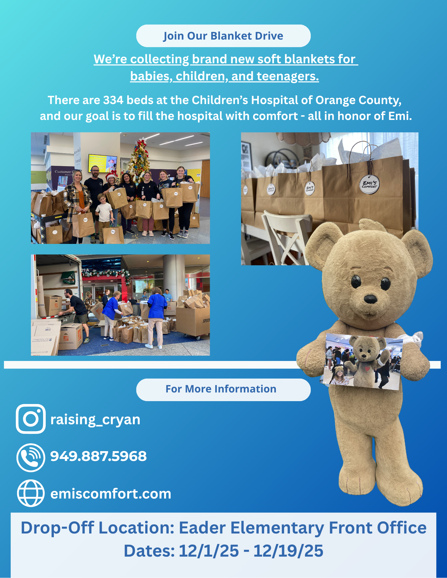 This month we’re partnering with Emi’s Comfort for a school-wide blanket drive to support children receiving care at CHOC.
