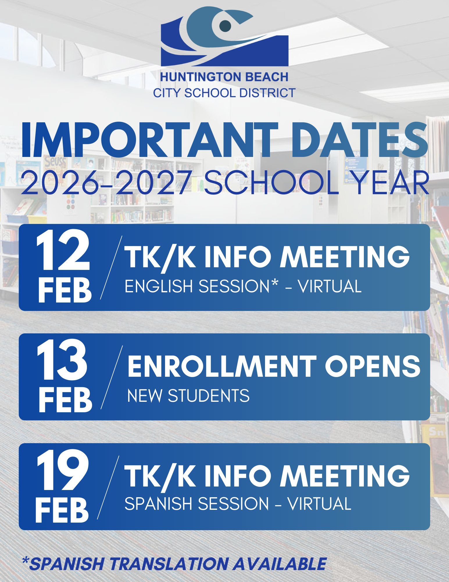 Transitional Kindergarten (TK) through 8th-grade Enrollment for the 2026–27 school year opens Friday, February 13, 2026, at 9:00 AM for new students joining Huntington Beach City School District (HBCSD).